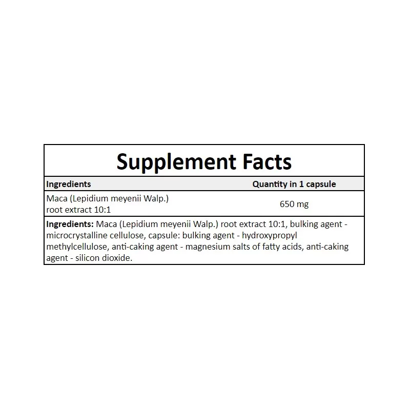 | Ekstrakt z korzenia Maca (Lepidium meyenii Walp.) 10:1 | 650 mg |