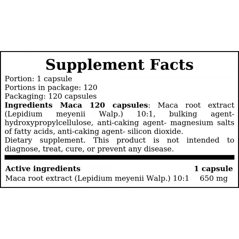Składniki Maca 120 kaps: Ekstrakt z korzenia Maca (Lepidium meyenii Walp.) 10:1, substancja wypełniająca- hydroksypropylomety-loceluloza, substancja przeciwzbrylająca- sole magnezowe kwasów tłuszczowych, substancja przeciwzbrylająca- dwutlenek krzemu.