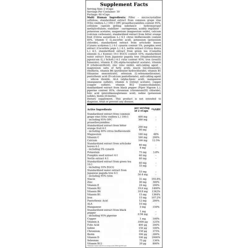 - ⚡ Zawiera aż 32 składniki aktywne, w tym bioaktywne witaminy, minerały w formach chelatowanych i standaryzowane ekstrakty roślinne.