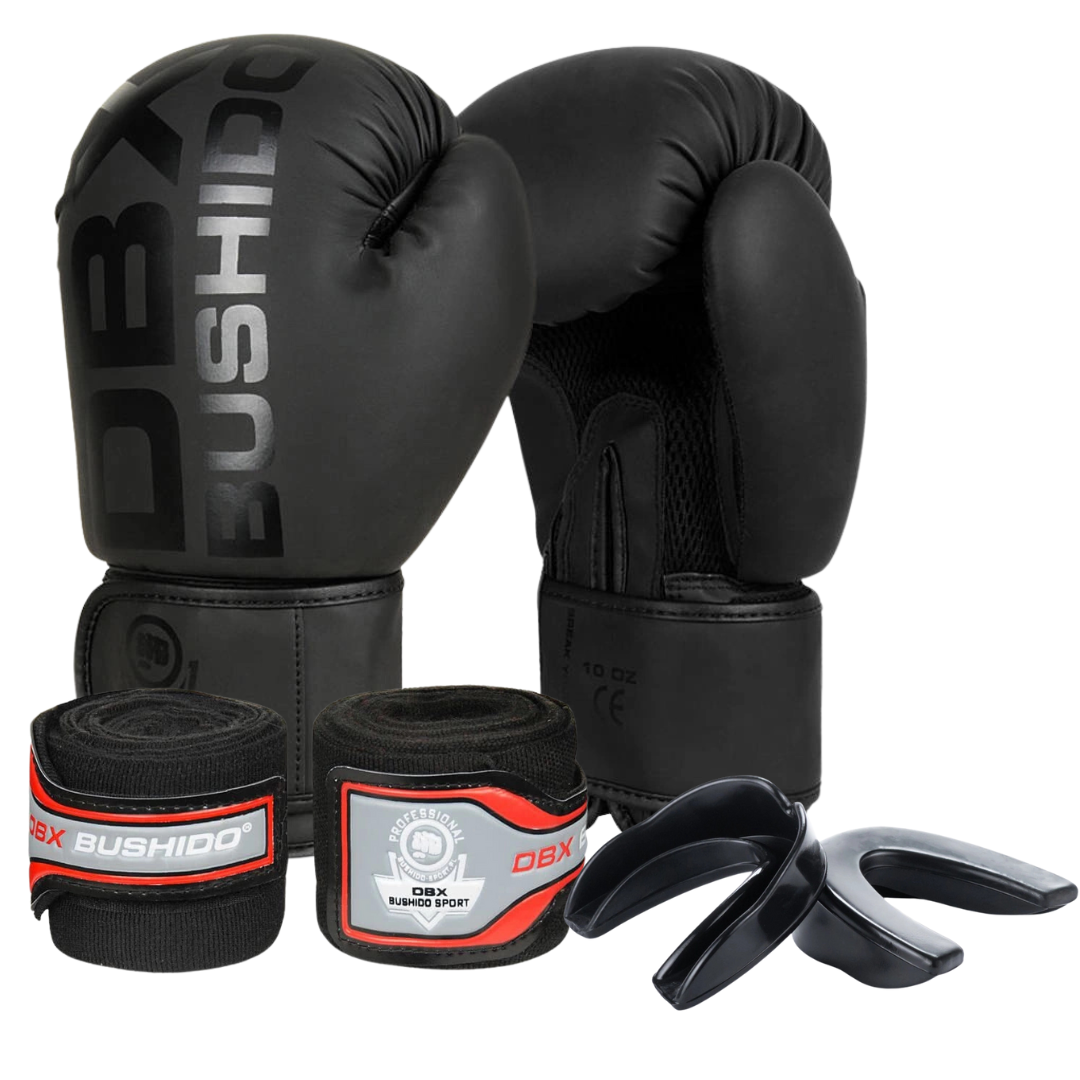 Zestaw startowy Bushido – rękawice bokserskie, owijki i szczęka. Idealny wybór dla początkujących i średniozaawansowanych, którzy chcą bezpiecznie i komfortowo rozpocząć treningi.